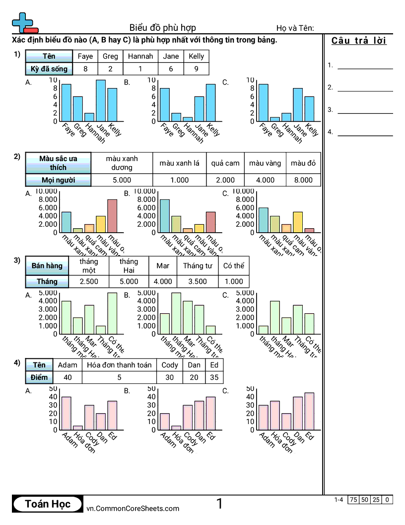 Phiếu bài tập math miễn phí cho Lớp 3 (3md3) về Biểu đồ phù hợp. Mỗi phiếu có 4 bài tập kèm đáp án và phù hợp cho giáo viên và học tại nhà. Bạn có thể tải PDF, tạo thẻ ghi nhớ hoặc dùng cho học trực tuyến.