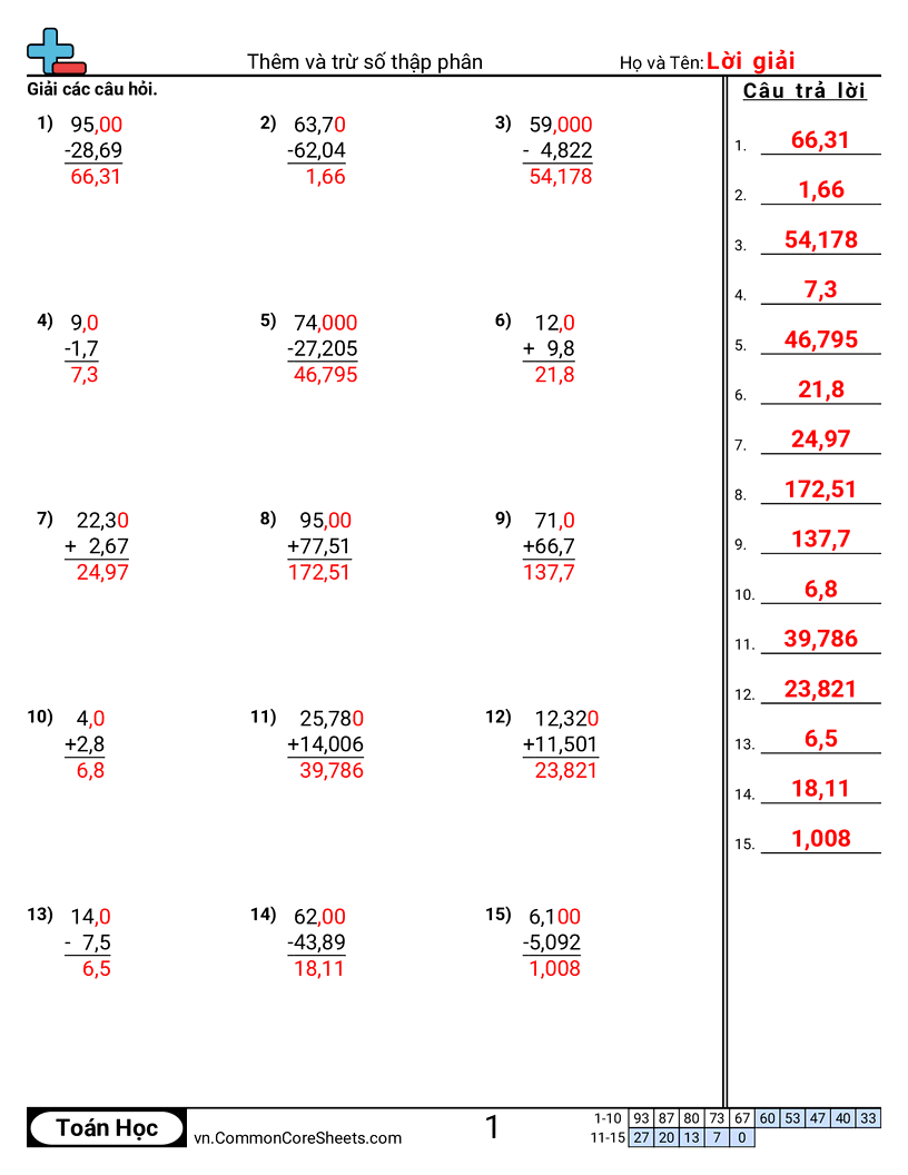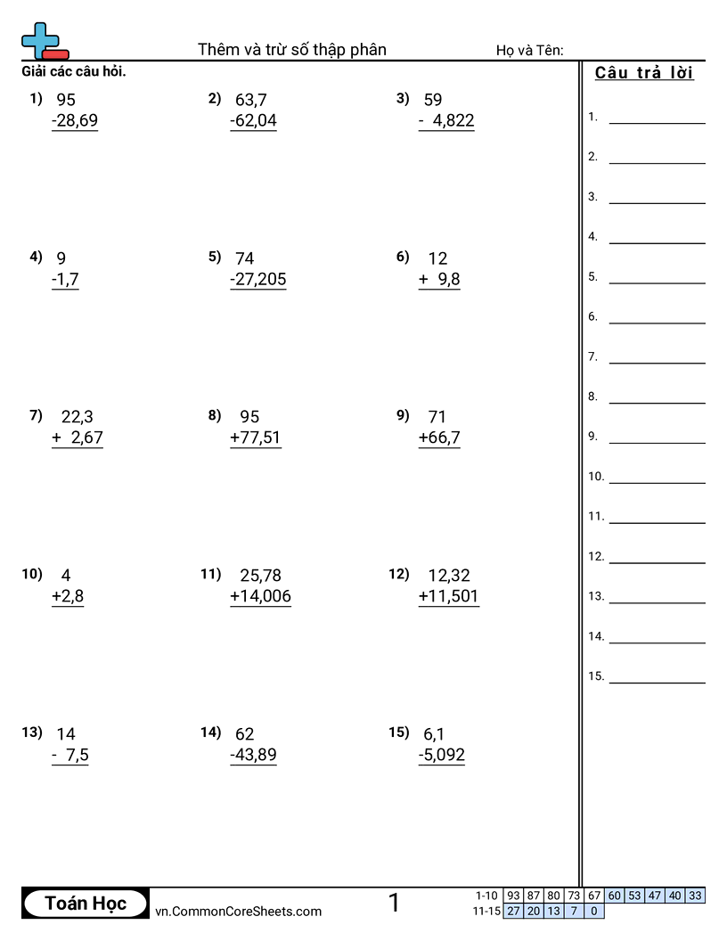 Mỗi bảng có 15 bài cộng & và trừ số thập phân.