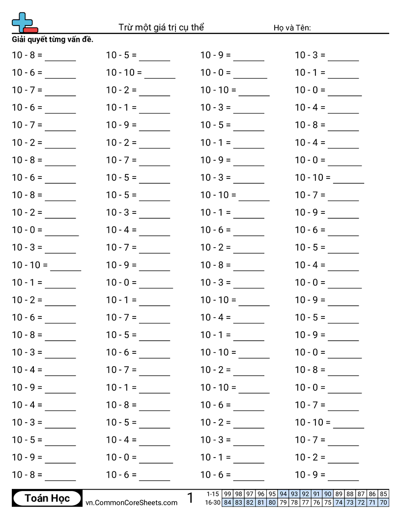 Phiếu bài tập math miễn phí cho Mẫu giáo (koa5) về Trừ một giá trị cụ thể. Mỗi phiếu có 100 bài tập kèm đáp án và phù hợp cho giáo viên và học tại nhà. Bạn có thể tải PDF, tạo thẻ ghi nhớ hoặc dùng cho học trực tuyến.