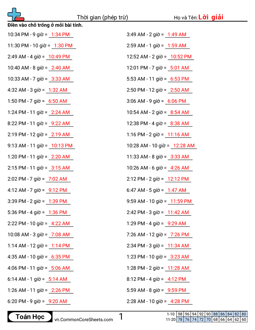 Phiếu bài tập math miễn phí về Thời gian (phép trừ). Mỗi phiếu có 50 bài tập kèm đáp án và phù hợp cho giáo viên và học tại nhà. Bạn có thể tải PDF, tạo thẻ ghi nhớ hoặc dùng cho học trực tuyến.