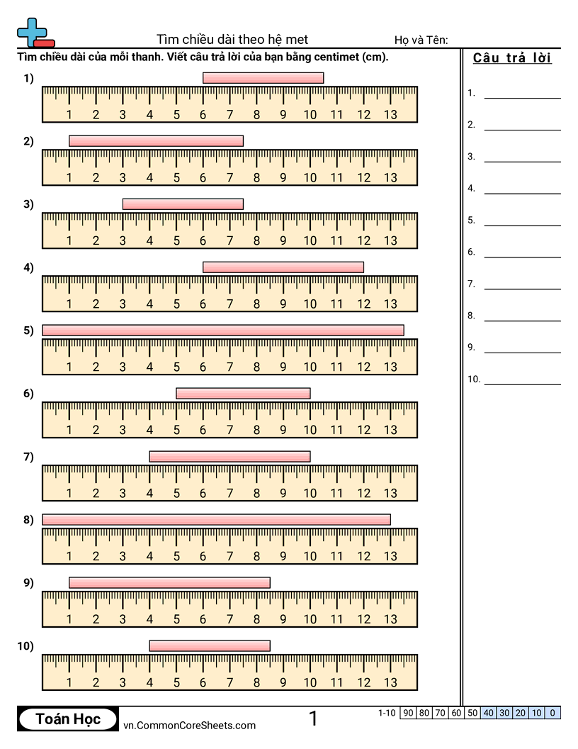 Mỗi trang gồm 10 câu xác định chiều dài của một sự vật. Chiều dài có thể tính bằng CM hay MM.