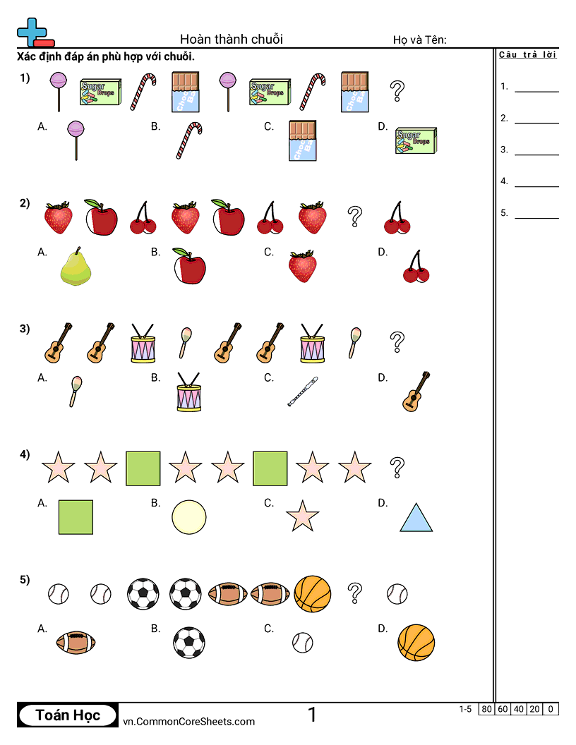 Phiếu bài tập math miễn phí về Hoàn thành chuỗi. Mỗi phiếu có 5 bài tập kèm đáp án và phù hợp cho giáo viên và học tại nhà. Bạn có thể tải PDF, tạo thẻ ghi nhớ hoặc dùng cho học trực tuyến.