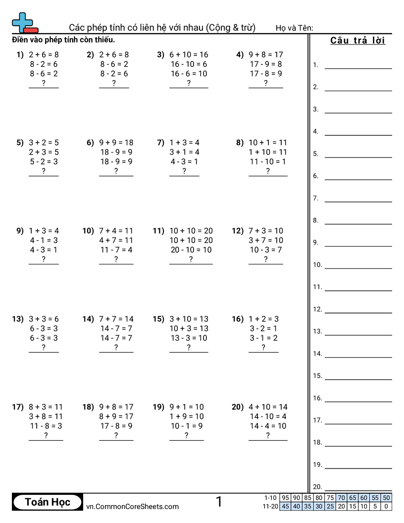 Phiếu bài tập math miễn phí về Các phép tính có liên hệ với nhau (Cộng & trừ). Mỗi phiếu có 20 bài tập kèm đáp án và phù hợp cho giáo viên và học tại nhà. Bạn có thể tải PDF, tạo thẻ ghi nhớ hoặc dùng cho học trực tuyến.