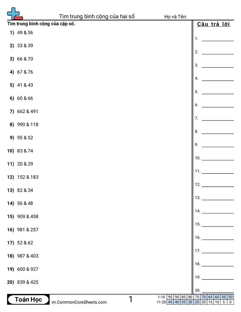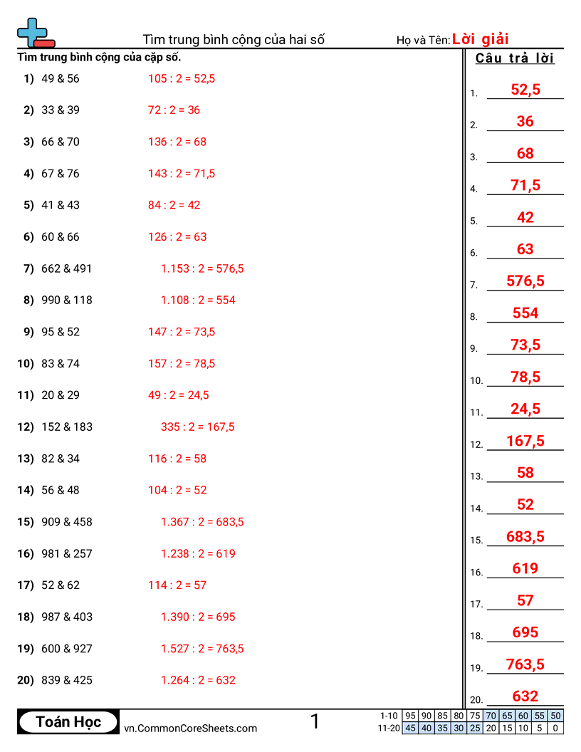 Mỗi bảng có 20 câu tìm trung bình cộng của hai số.