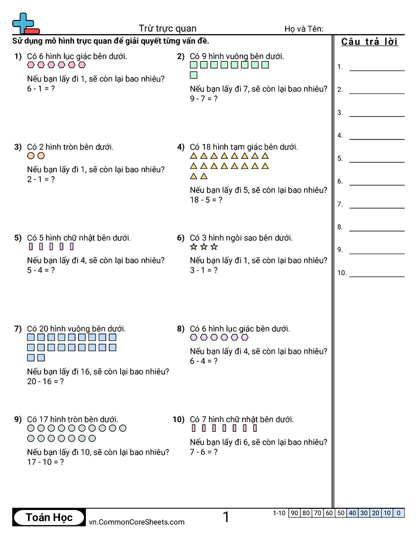 Phiếu bài tập math miễn phí cho Lớp 1 () về Trừ trực quan. Mỗi phiếu có 10 bài tập kèm đáp án và phù hợp cho giáo viên và học tại nhà. Bạn có thể tải PDF, tạo thẻ ghi nhớ hoặc dùng cho học trực tuyến.
