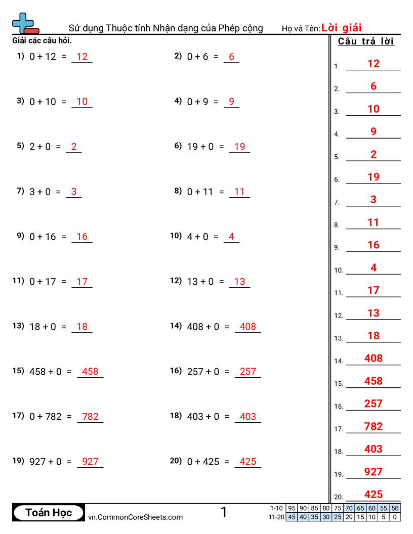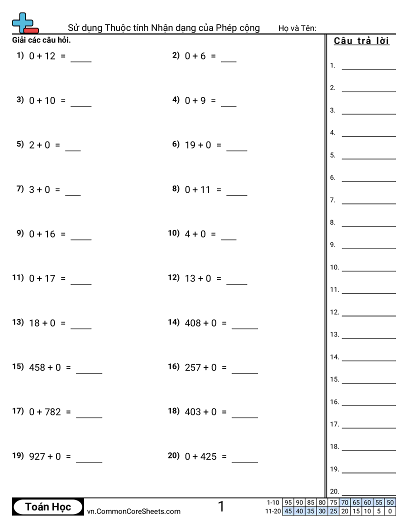 Phiếu bài tập math miễn phí về Sử dụng Thuộc tính Nhận dạng của Phép cộng. Mỗi phiếu có 20 bài tập kèm đáp án và phù hợp cho giáo viên và học tại nhà. Bạn có thể tải PDF, tạo thẻ ghi nhớ hoặc dùng cho học trực tuyến.