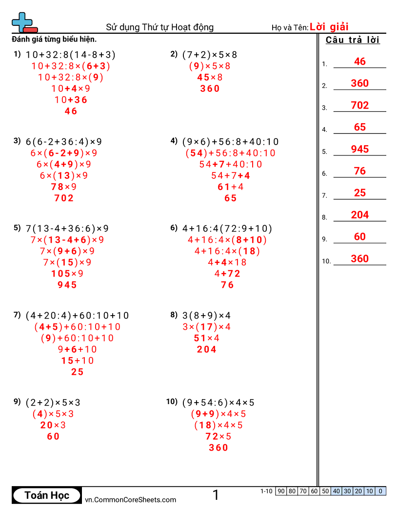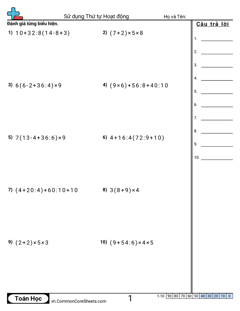 Phiếu bài tập math miễn phí về Sử dụng Thứ tự Hoạt động. Mỗi phiếu có 10 bài tập kèm đáp án và phù hợp cho giáo viên và học tại nhà. Bạn có thể tải PDF, tạo thẻ ghi nhớ hoặc dùng cho học trực tuyến.