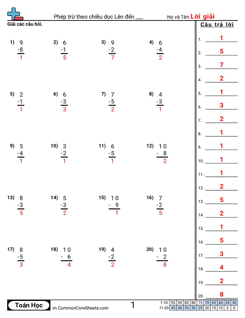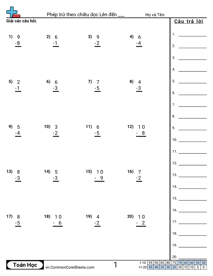 Phiếu bài tập math miễn phí về Phép trừ theo chiều dọc Lên đến ___. Mỗi phiếu có 20 bài tập kèm đáp án và phù hợp cho giáo viên và học tại nhà. Bạn có thể tải PDF, tạo thẻ ghi nhớ hoặc dùng cho học trực tuyến.
