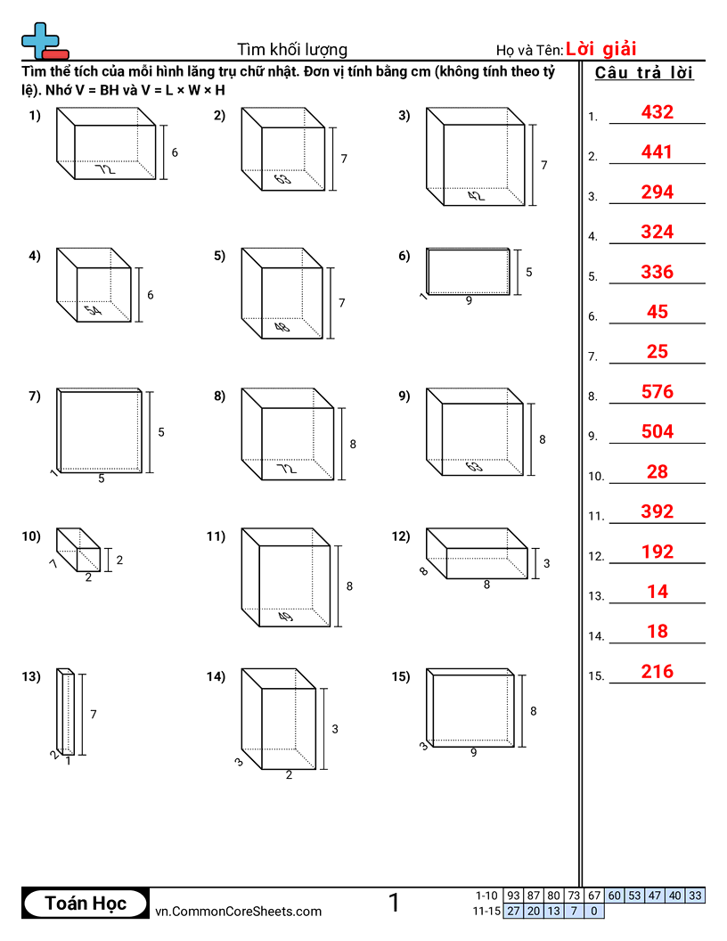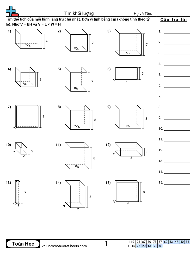 Mỗi trang có 15 câu tìm thể tích của một hình hộp chữ nhật.