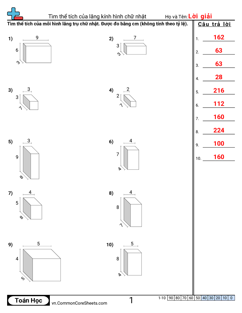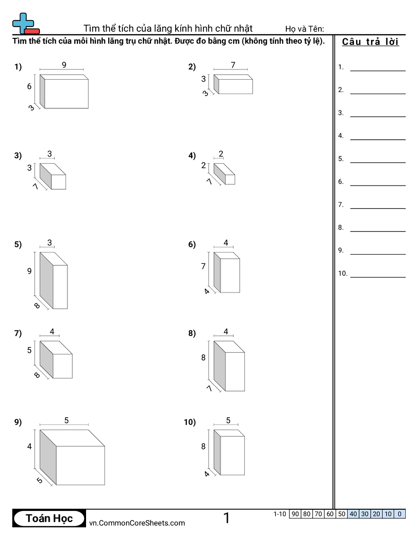Phiếu bài tập math miễn phí cho Lớp 5 (5md5b) về Tìm thể tích của lăng kính hình chữ nhật . Mỗi phiếu có 10 bài tập kèm đáp án và phù hợp cho giáo viên và học tại nhà. Bạn có thể tải PDF, tạo thẻ ghi nhớ hoặc dùng cho học trực tuyến.
