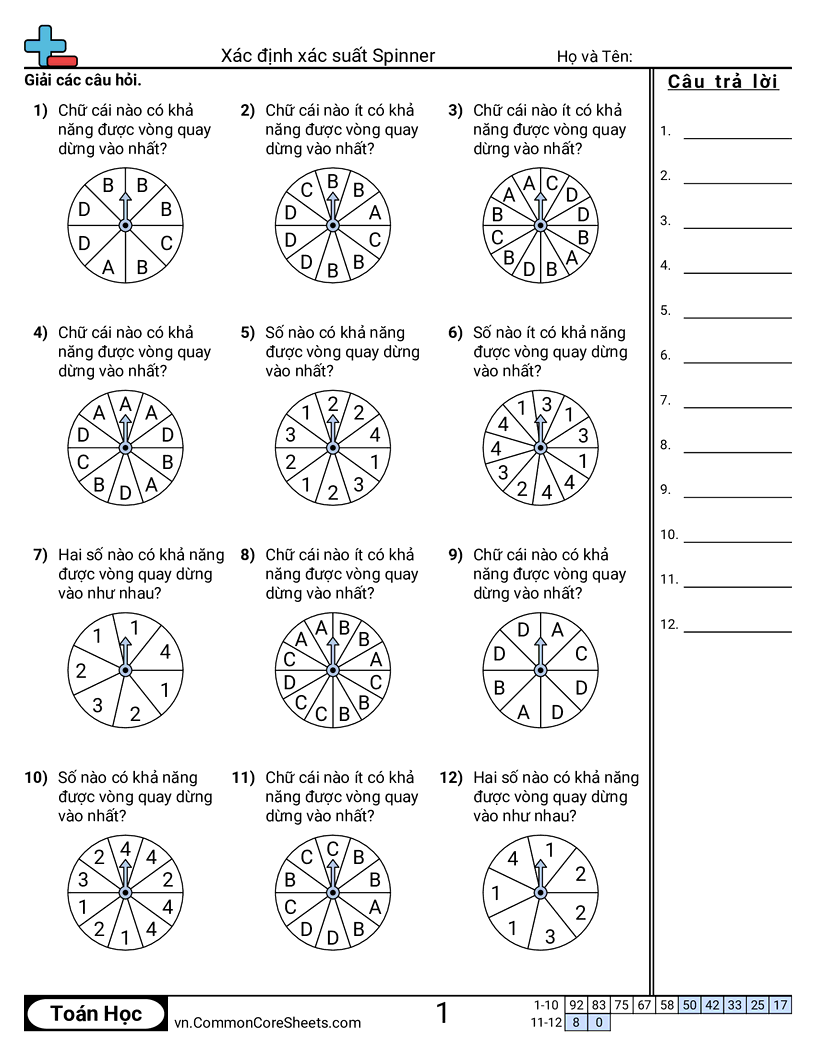 Phiếu bài tập math miễn phí về Xác định xác suất Spinner. Mỗi phiếu có 12 bài tập kèm đáp án và phù hợp cho giáo viên và học tại nhà. Bạn có thể tải PDF, tạo thẻ ghi nhớ hoặc dùng cho học trực tuyến.