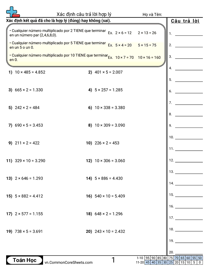 Mỗi trang gồm 30 bài tính xác định kết quả có phải là câu trả lời đúng.