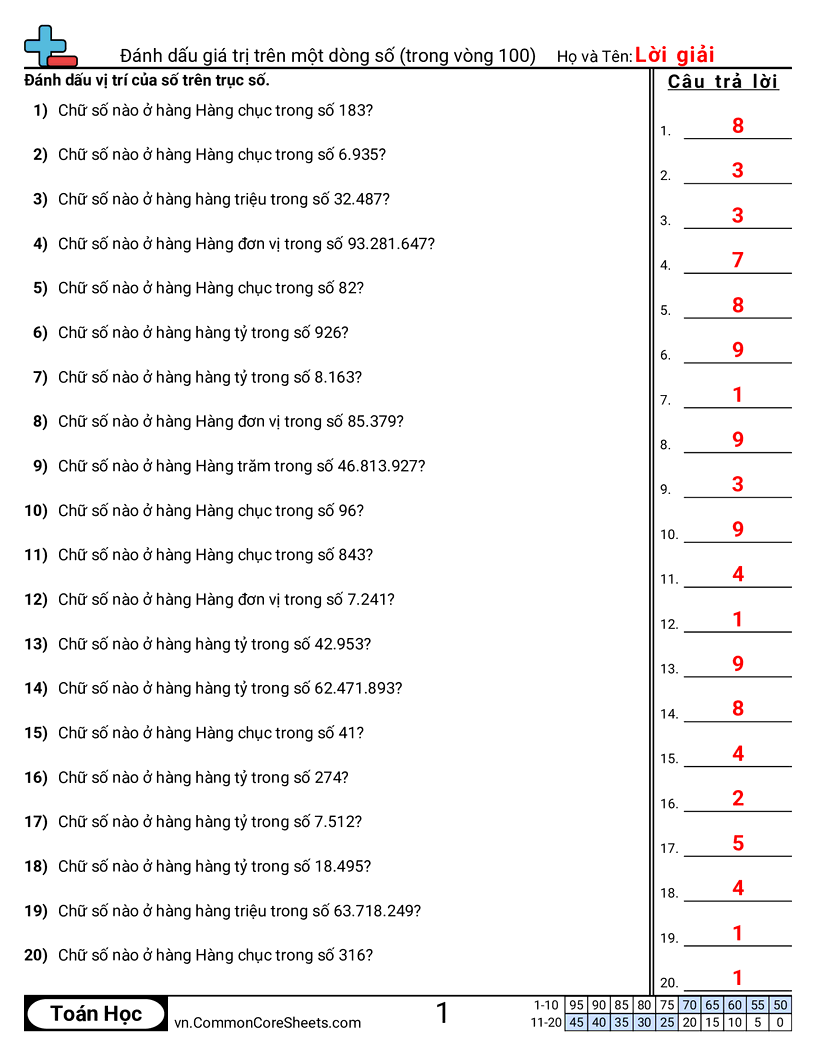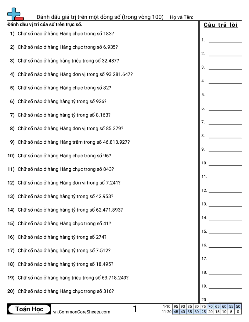 Mỗi trang có 20 câu xác định vị trí của một chữ số.