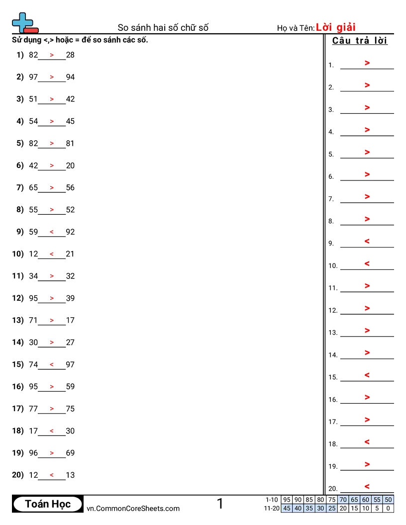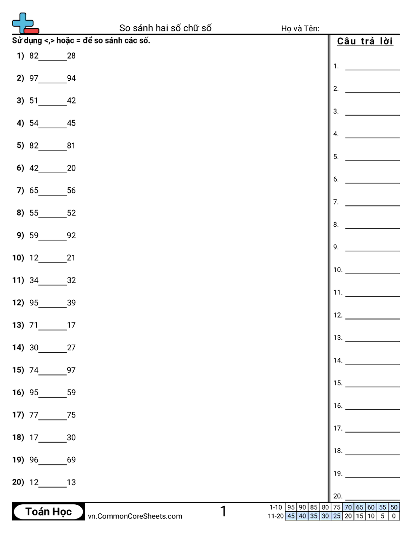 Phiếu bài tập math miễn phí cho Lớp 1 (1nbt3) về So sánh hai số chữ số . Mỗi phiếu có 20 bài tập kèm đáp án và phù hợp cho giáo viên và học tại nhà. Bạn có thể tải PDF, tạo thẻ ghi nhớ hoặc dùng cho học trực tuyến.